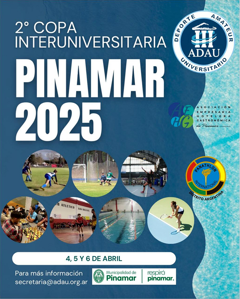 ADAU 2º Copa Interuniversitaria ADAU – PINAMAR 2025 13 marzo, 202513 marzo, 2025 c1340591 Se llevará a cabo en la ciudad de Pinamar, Buenos Aires los días 4, 5 y 6 de Abril. Se convoca a participar en Ajedrez, Natación, Hockey (femenino); Fútbol, Básquet, Tenis y Voleibol (todos femenino y masculino) .
